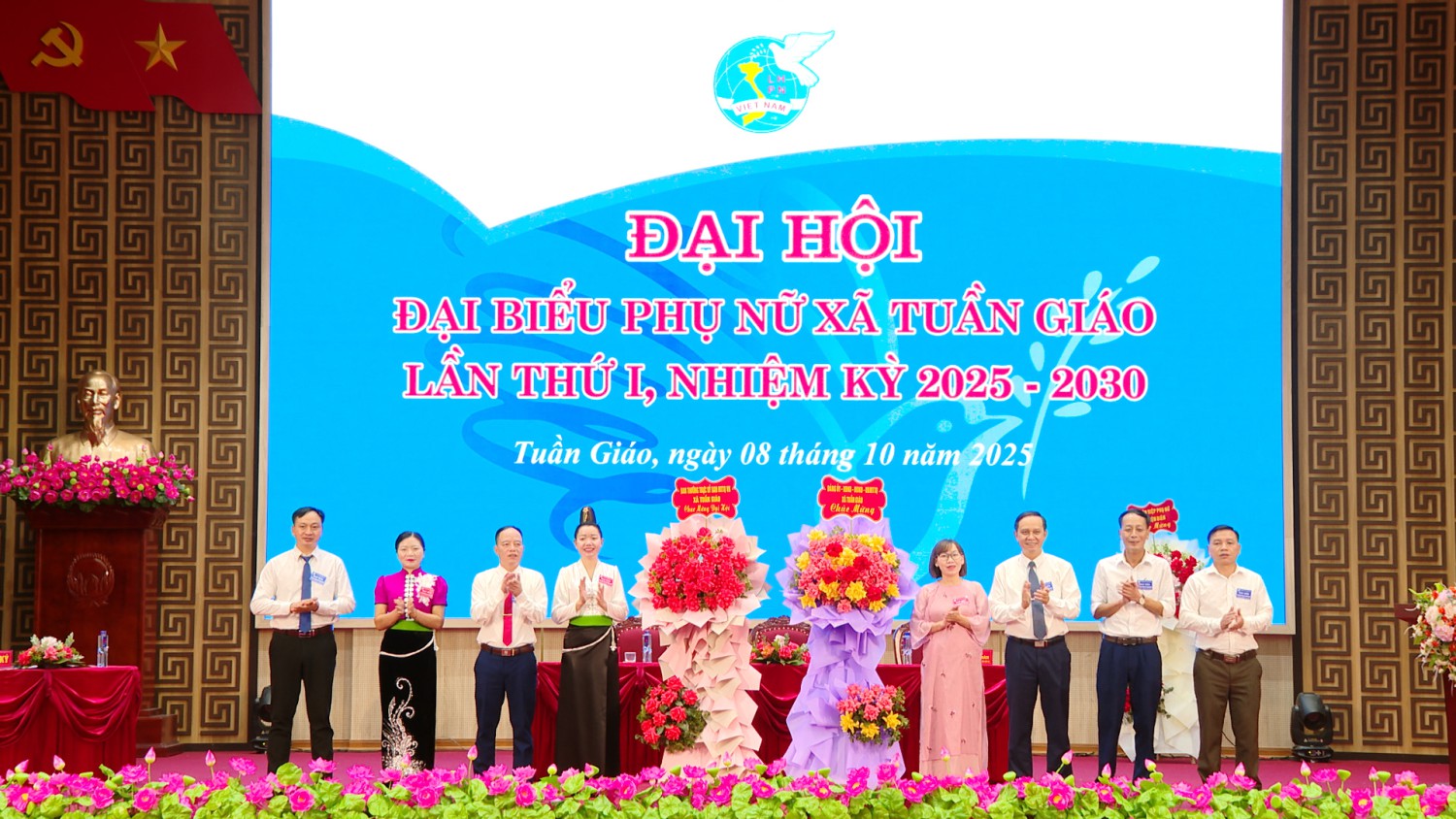 Đại diện lãnh đạo ĐU - HĐND - UBND - UB MTTQ xã gửi lẵng hoa chúc mừng Đâị hội Đại biểu Hội LHPN xã Tuần Giáo, lần thứ I, nhiệm kỳ 2025 - 2030