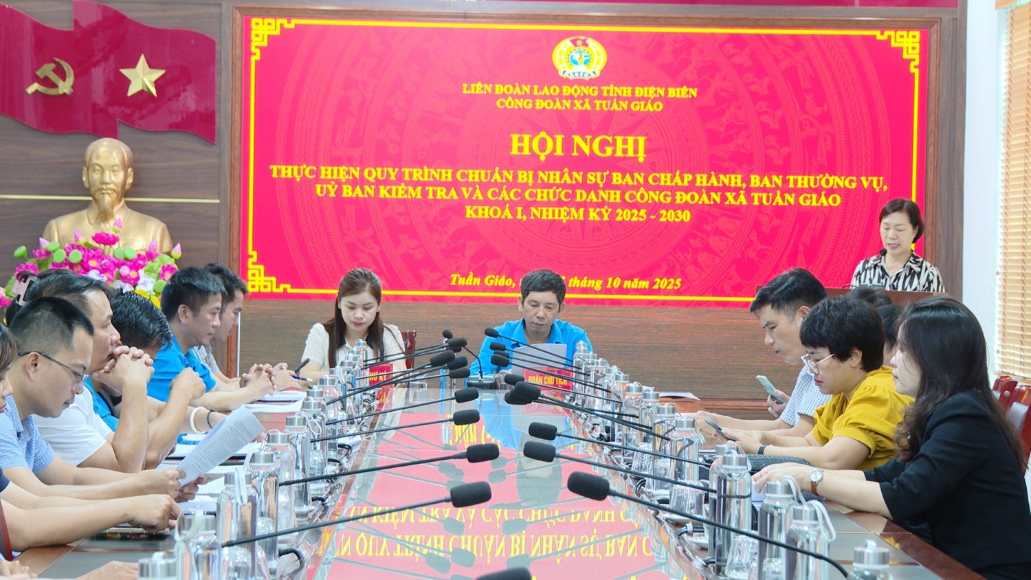 Hội nghị đã thông qua Hướng dẫn số 28/HD-LĐLĐ ngày 06/10/2025 của Ban Thường vụ Liên đoàn Lao động tỉnh Điện Biên về một số nội dung công tác nhân sự Đại hội công đoàn các cấp tiến tới Đại hội lần thứ XIII Công đoàn tỉnh Điện Biên, nhiệm kỳ 2025-2030 và Kế hoạch số 06/KH-CĐX ngày 01/10/2025 của Ban Thường vụ Công đoàn xã Tuần Giáo về việc tổ chức Đại hội Đại biểu Công đoàn xã Tuần Giáo lần thứ I, nhiệm kỳ 2025-2030. Thông qua Đề án chuẩn bị nhân sự Ban Chấp hành, Ban Thường vụ, Uỷ ban Kiểm tra và các chức danh Công đoàn xã Tuần Giáo khoa I, nhiệm kỳ 2025-2030.Thực hiện quy trình chuẩn bị nhân sự Ban Chấp hành, Ban Thường vụ, Uỷ ban Kiểm tra và các chức danh Công đoàn xã Tuần Giáo khoá I, nhiệm kỳ 2025-2030.