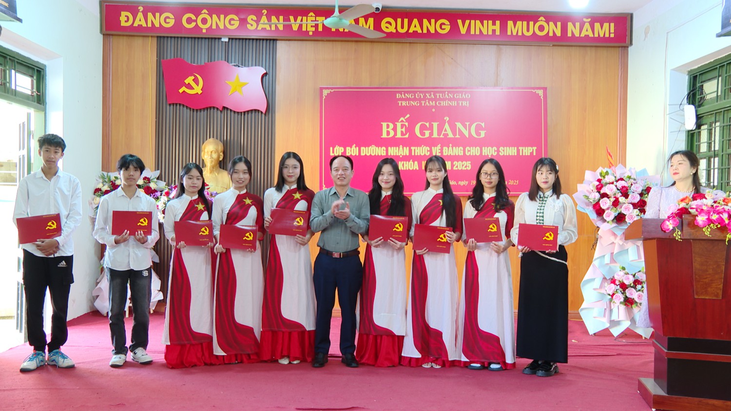 Phát biểu tại lễ bế giảng, đồng chí Nguyễn Duy Lâm- Phó Bí thư Thường trực Đảng uỷ xã; đồng chí Lê Ngọc Sơn-UVBTV, Trưởng Ban Xây dựng Đảng, Giám đốc Trung tâm Chính trị xã Tuần Giáo nhấn mạnh: Lớp bồi dưỡng nhận thức về Đảng khoá III năm 2025 được tổ chức và hoàn thành đảm bảo đúng mục đích, yêu cầu, tiến độ thời gian đề ra và đã thành công tốt đẹp; 42/42 học viên đủ điều kiện kiểm tra đều được cấp giấy chứng nhận hoàn thành chương trình bồi dưỡng. Kết quả đó thể hiện sự trách nhiệm, nỗ lực, cố gắng của Trung tâm Chính trị xã, của các đồng chí cán bộ, giảng viên Trung tâm. Đồng chí cũng biểu dương, ghi nhận tinh thần nghiêm túc chấp hành các nội quy, quy chế, ý thức cầu thị, trách nhiệm trong học tập của các học viên.