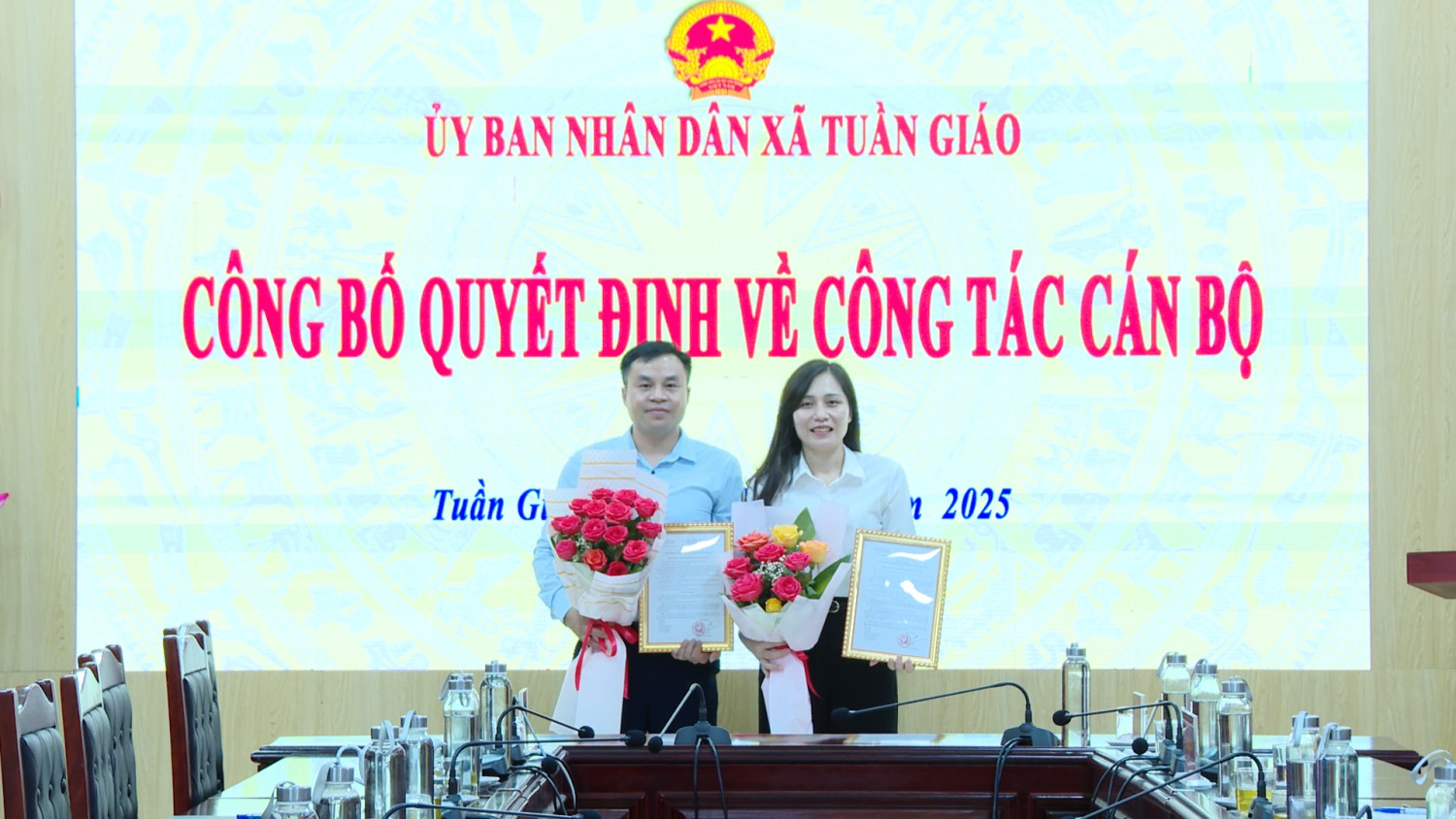 Tại buổi Lễ, lãnh đạo Phòng Văn hóa - Xã hội đã công bố Quyết định các số: 375/QĐ-UBND và 376/QĐ-UBND ngày 31/10/2025 của UBND xã Tuần Giáo về việc điều động và bổ nhiệm viên chức giữ chức vụ lãnh đạo quản lý. Theo Quyết định, tiếp nhận và bổ nhiệm đồng chí Lò Văn Nam- Phó Hiệu trưởng Trường PTDTBT THCS Sín Chải, xã Sín Chải giữ chức vụ Phó Hiệu trưởng Trường THCS Tuần Giáo, xã Tuần Giáo; Điều động và bổ nhiệm đồng chí Bạc Thị Thanh Thuỳ- Giáo viên Trường Mầm non Quài Nưa đến nhận nhiệm vụ và giữ chức vụ Phó Hiệu trưởng Trường Mầm non Sơn Ca, xã Tuần Giáo. Thời hạn bổ nhiệm là 05 năm kể từ ngày 01/11/2025.