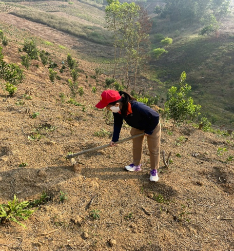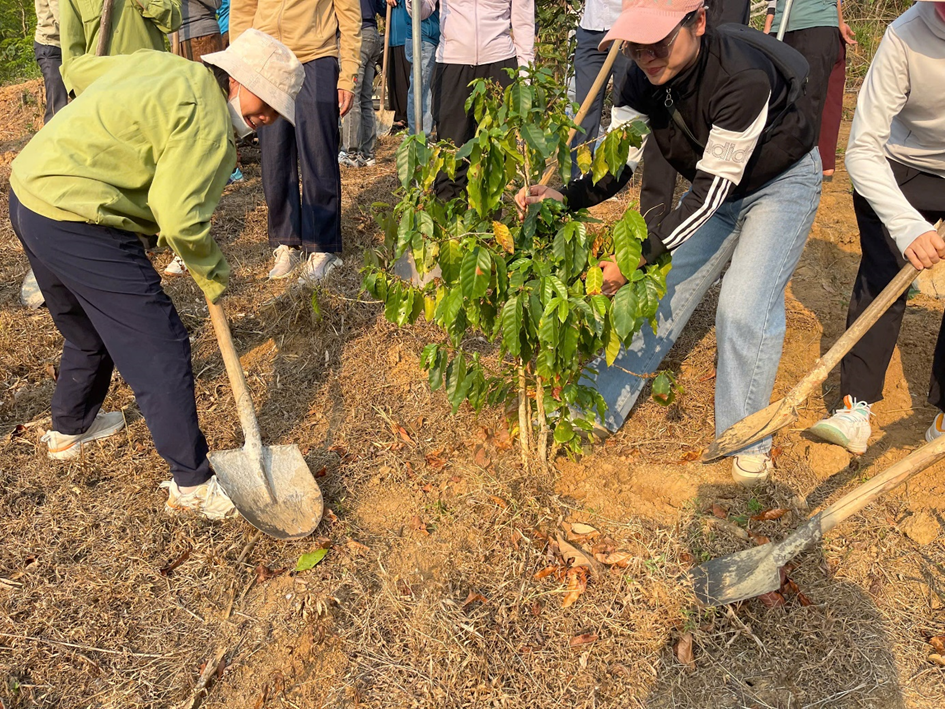 Cán bộ giáo viên, nhân viên tích cực tham gia đào hố trồng mắc ca, góp phần cùng nhân dân phát triển kinh tế địa phương.